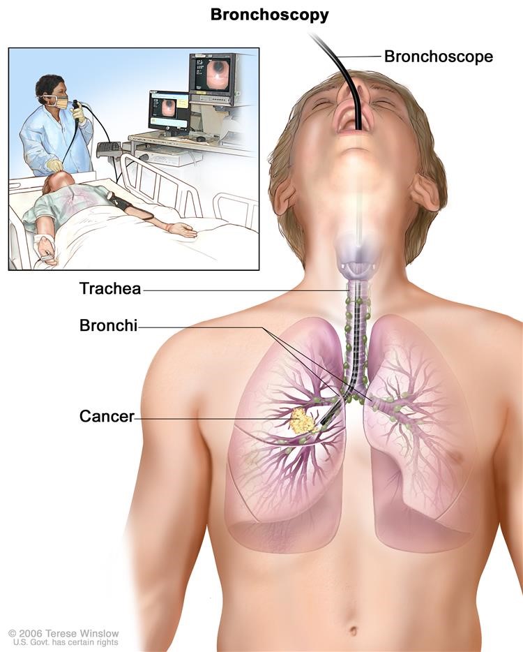A bronchoscope is inserted through the mouth, trachea, and major bronchi into the lung, to look for abnormal areas. A bronchoscope is a thin, tube-like instrument with a light and a lens for viewing. It may also have a cutting tool. Tissue samples may be taken to be checked under a microscope for signs of disease.