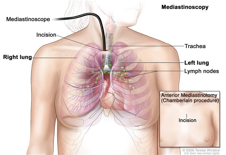 Figure 5: A bronchoscope is inserted through the mouth, trachea, and major bronchi into the lung, to look for abnormal areas. A bronchoscope is a thin, tube-like instrument with a light and a lens for viewing. It may also have a cutting tool. Tissue samples may be taken to be checked under a microscope for signs of disease.